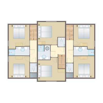 • Zes slaapkamers met twee 1-persoons boxsprings op de eerste verdieping